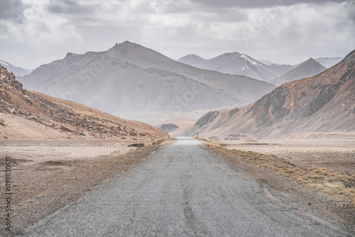 Asphalt road of the Pamir Highway in the valley of the Tien Shan Mountains in Tajikistan in the Pamirs, landscape in the high desert mountains for background, the road goes into the distance