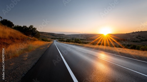 road, sunset, sky, gold, field, hill, asphalt, travel, journey, sunlight, horizon, scenic, outdoors, nature, landscape, perspective, straight, clear, light, bright, warmth, adventure, freedom, destination, peak, beauty, tranquil, peaceful, serene, open, expanse, long, winding, path, distant, mountain, silhouette, tree, grass, dry, rural, route, evening, glowing, vibrant