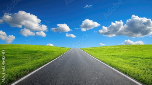 Asphalt road stretching through vibrant green fields under a bright blue sky with clouds perfect for travel and outdoor adventures