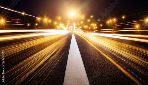 asphalt road with white lines and blurred lights a city street at night golden and black colors abstract and hopeful urban exploration