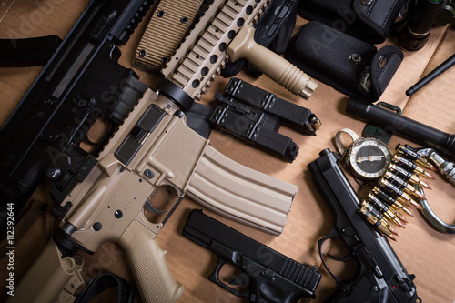 army, assault, compass, concept, desk, desktop, kit, nobody, note, notebook, object, pen, place, rifle, space, table, top, view, weapon, workplace