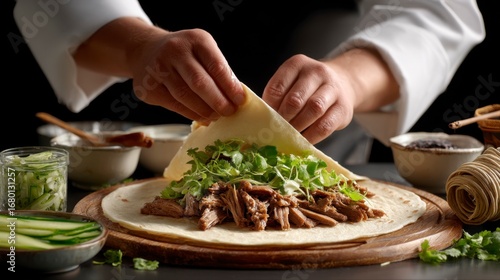 crispy, beijing, duck, battercake, assembly, hand, food, culinary, preparation, epicure, cookery, delicious, herb, scallion, wrap, meal, dish, chef, kitchen, ingredient, texture, savoury, fresh, cooking, style, plate, favor, receipe, dining, eatery, traditional, delicacy, presentation, wrapping, soft, tender, succulent, artistry