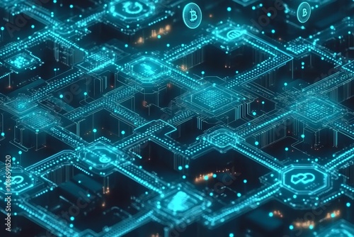 pathway, circuit, digital, asset, glowing, blue, toned, dot, asset, digitization, token, journey, holographic, value, transfer, transformation, labyrinth, scalable, geometric, shape, precision, illustration, clean, line, vector, art, print, landscape, background, desktop, wallpaper