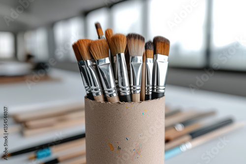 paintbrush, artist, cardboard, studio, table, brush, painting, art, supply, creativity, tool, handle, bristle, variety, set, display, holder, indoor, workspace, arrangement, window, light, natural, surface, workshop, equipment, creative, medium, inspiration, design, wooden, metallic, organised, stationary, resource, painter, professional, hobby, artistic, classroom, material, detailed, texture, precision, sharpened