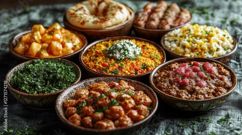 food, meal, dinner, lunch, cookery, dish, bowl, plate, tasty, delicious, accessing, side, vegetable, meat, chicken, chickpea, sausage, rice, couscous, curry, potato, spinach, corn, healthy, colourful, vibrant, epicure, banquet, feast, buffet, catering, eatery, savoury, spicey, flavorful, aromatic, texture, ingredient, cooking, kitchen, eat, eating, table, background, style, fresh, homemade, market
