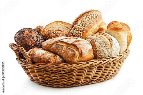 "Assorted Bread in Basket – Fresh Bakery Products on White Background"