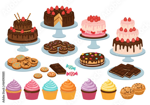 Assorted Cakes, Cupcakes, Cookies, and Chocolate Desserts Illustration