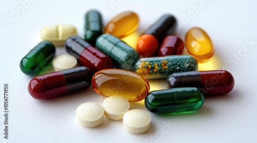 Assorted capsules and colored tablets including vitamins and various pills