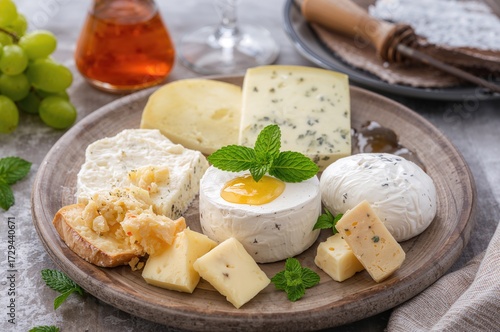 Assorted cheese platter featuring pear, honey, and fresh mint