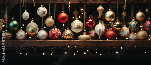 Assorted Christmas Ornaments Hanging on Rustic Wooden Backdrop