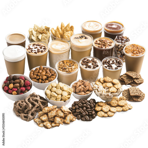 Assorted coffee drinks and snacks displayed for a food product catalog