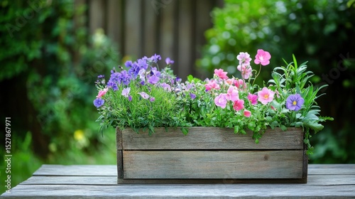 Assorted colorful flowers in a rustic wooden crate placed on a garden table, surrounded by greenery