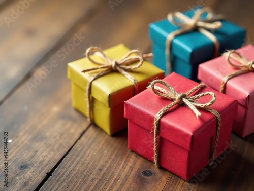 Assorted colorful gift boxes with twine, wooden surface , colorful, decorations, wood