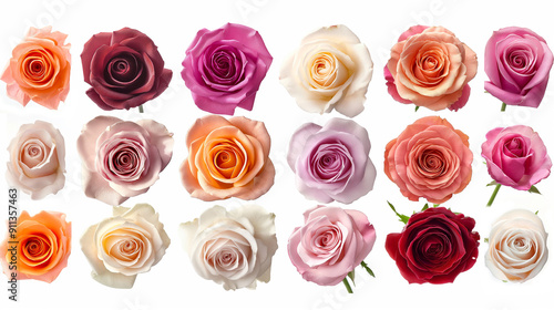 Assorted Colorful Roses Arranged in Four Rows on a Clean White Background