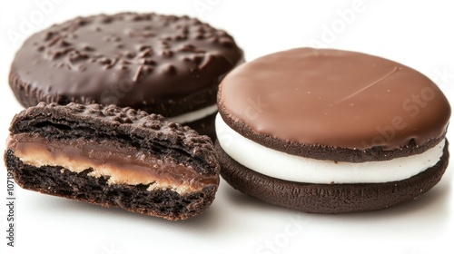 cookie, dessert, sweet, chocolate, cream, snack, treat, food, indulgence, close, up, assorted, 2, round, dark, confectionery, texture, arrangement, favor, crunchy, savoury, delicious, appetising, epicure, bakery, photo, closeup, fresh, ingredient, simple, white, composition, studio, light, surface, pattern, image, classic, bite, cleaving, slice, topping