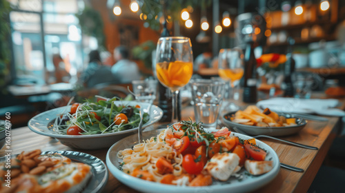 food, dish, table, eatery, salad, pasta, cocktail, dining, meal, lunch, dinner, cookery, tomatoes, mozzarella, fresh, wooden table, plate, beverage, drink, indoor, arrangement, glasses, tasty, ingredient, epicure, table setting, vegetable, delicious, nourishment