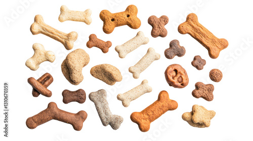 Assorted dog treats shaped like bones on a white isolated background.