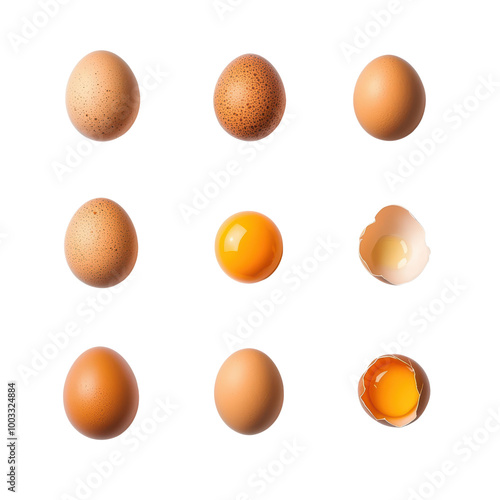 Assorted eggs in various states including whole and cracked, isolated on a white background. isolated on transparent background.