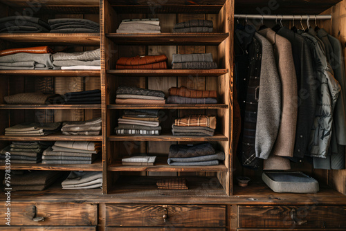 clothes, clothes rack, wooden, shelf, folded, retail, display, casual attire, fashion, organisation, interior, textile, menswear, shirt, sweater, pant, denim, shop, store, neat, tidy, assortment, collection, fabric, material, brown, beige, grey, space, storage, style, home, personal, closet, elegance, variety, indoor, cotton, arrangement, merchandise, interior design, stack, horizontal, wool, photo, no people, color image, in a row