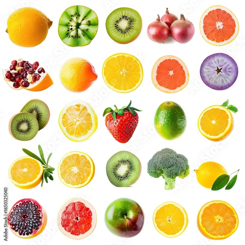 fruit, vegetable, slice, lemon, kiwi, grapefruit, orange, onion, strawberry, pomegranate, peach, broccoli, apple, lime, cut, healthy, fresh, vitamin, nourishment, diet, colourful, vibrant, food, organic, freshness, natural, delicious, alimentary, produce, segment, red, green, yellow, purple, pink, isolated, background, white, closeup, studio, macro