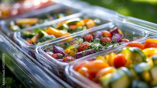 vegetable, tomatoes, pepper, onion, cucumber, courgette, herb, salad, container, clear, plastic, buffet, catering, party, event, food, fresh, healthy, delicious, colourful, vibrant, red, yellow, green, orange, purple, summer, garden, sunlight, bright, garnish, chopped, diced, serving, display, presentation, arrangement, row, line, texture