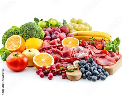 fruit, meat, broccoli, orange, grape, strawberry, banana, tomatoes, lemon, apple, blueberry, slice, chopping board, still life, arrangement, display, red, green, yellow, purple, fresh, raw, food, white, background, isolated, nourishment, healthy eating, ingredient, variety, closeup, studio shot, prosciutto, snack, basil, wooden bowl, diet, wellness, balanced diet