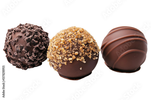 Assorted gourmet chocolate truffles with various toppings isolated on white, cut out