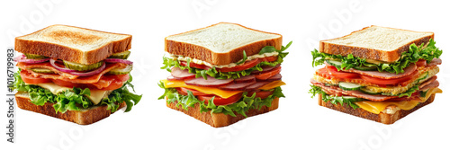 Assorted gourmet club sandwiches with layers of meat and vegetables isolated on transparent background food PNG for restaurant menu designs or sandwich advertisements