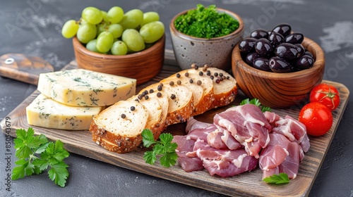 snack, cheese, bread, grape, olive, meat, green, epicure, wooden, board, dish, gouda, parsley, dip, assort, slice, baguette, spinach, zest, chutney, feta, art, preserve, sample, healthy, favor, taste, platter, lettuce, cookery
