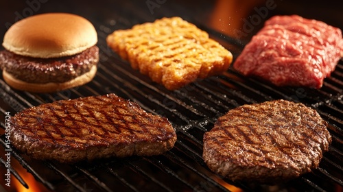Assorted grilled steaks and burger patty with crispy waffle fry on a barbecue grill hot cooking scene