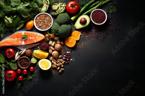 salmon, fish, vegetable, fruit, nut, healthy, food, organic, protein, omega, tomatoes, citrous, pepper, diet, alimentary, balanced, eating, black, background, spinach, avocado, broccoli, almond, seed, grain, leafy, fresh, produce, vitamin, whole, raw, culinary, wellness, lifestyle, ingredient
