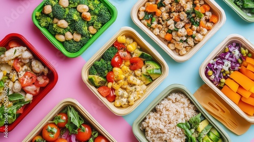 Assorted healthy meals in eco-friendly boxes, vibrant colors, nutritious variety.