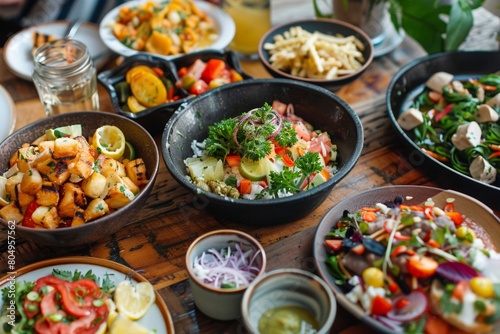 Assorted healthy salads on a wooden table