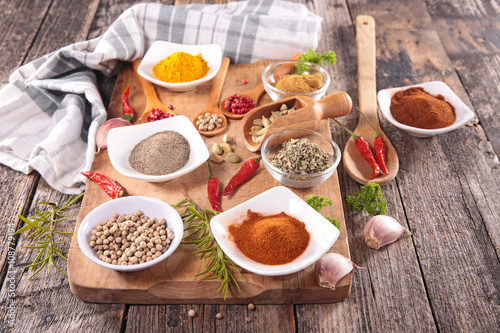 herb, spice, board, chili, pepper, spicey, coriander, assorted, cinnamon, cooking, ingredient, cookery, dry, food, grocery, variety, wood, background, assortment, composition, colourful