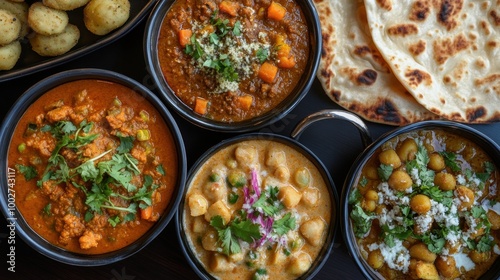 Assorted Indian cuisine featuring vegetable curry, papad, jeera aloo, and chana masala, with naan bread and vibrant garnishes.
