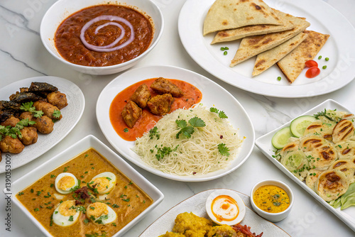 Assorted Indian Dishes Overhead Colorful Curry Naan Seafood Eggs Meal