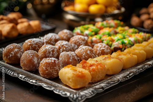 Assorted Indian sweets like laddoos and barfis arranged on a silver tray, festive decor in the background