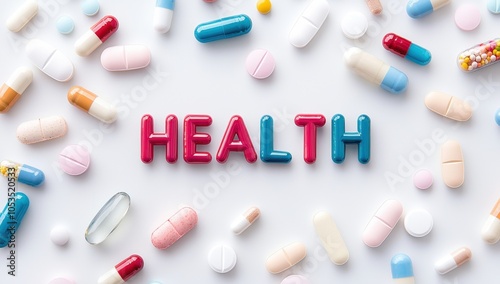 health, medicine, pill, capsule, drug, medication, pharmaceutical, health care, wellness, treatment, prescription, medicals, pharmacy, vitamin, supplement, antibiotic, painkiller, assortment, variety, many-coloured, background, concept, text