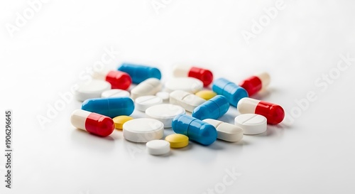 Assorted medication capsules scattered on a flat surface viewed from directly above