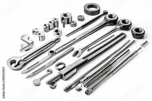 nut, bolt, wrench, spanner, tool, metal, steel, machined, part, component, precision, engineering, manufacturing, industrial, hardware, equipment, mechanic, workshop, fabrication, technology, industry, gear, machinery, chrome, silver, shiny, alloy, white, background, collection