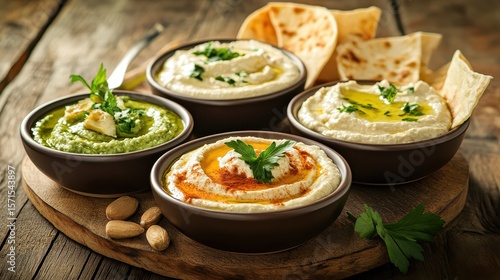 Assorted Middle Eastern Dips Served with Fresh Flatbread and Herbs