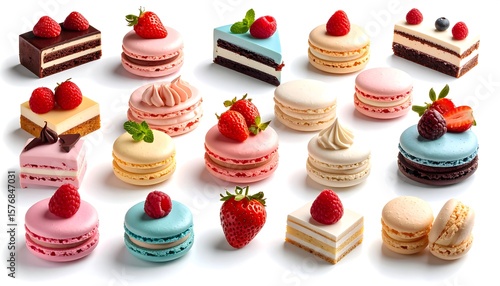 dessert, cake, pastry, treat, colourful, sweet, delicious, miniature, strawberry, raspberry, mint, cream, chocolate, layered, topping, fresh, beautiful, display, artisanal, food, arrangement, pretty, isolated, white, background, stacked, piece, individual, freshness, composition, food photography, presentation, tasty, light, vibrant, high-quality, professional, closeup