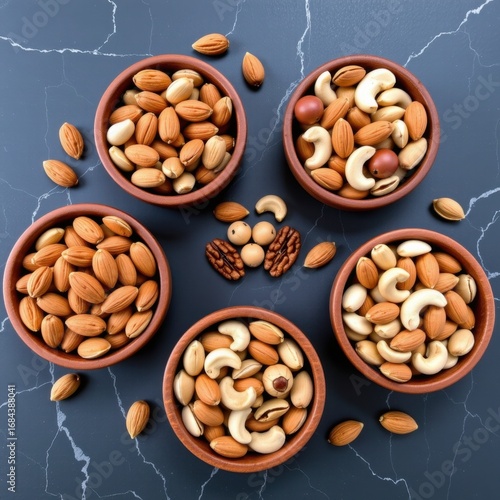 Assorted Mixed Nuts in Small Terracotta Bowls on Dark Cracked Surface with Scattered Nuts and Seed Decorations, Close-up, Top View