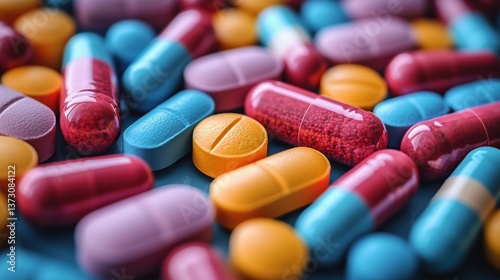 Assorted multicolored capsules and tablets, flat lay on blue background, soft lighting, pharmaceutical theme (16:9)