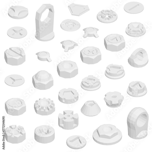 Assorted nuts and bolts in various shapes and sizes, including hexagonal and rounded types with glossy finishes. Collection is displayed on a bright white background for stark contrast. Isometric view