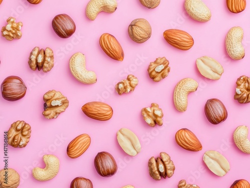 Assorted nuts flat lay on pink background studio shot overhead view healthy snack ingredient almond cashew hazelnut peanut walnut