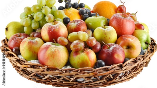 Assorted organic fruits in a wicker basket, including apples, grapes, and berries, vibrant and fresh.