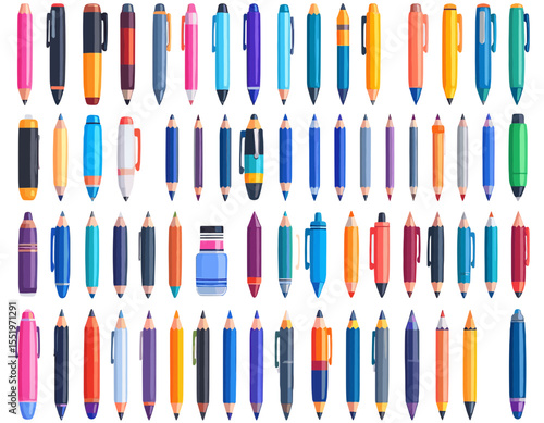 Assorted Pens and Markers Collection in Various Colors on White Background