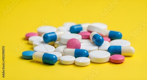 pill, capsule, medication, drug, medicine, tablet, health care, medicals, pharmacy, supplement, vitamin, yellow background, assorted, variety, pile, heap, health, treatment, wellness, prescription, pharmaceutical, clinic, drugged, addiction, overdose, colourful, white, pink, blue, copy space, horizontal, studio shot, macro, background, therapy