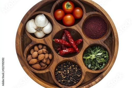 Assorted spices, herbs, and ingredients arranged in a wooden tray for cooking preparations in a kitchen setting